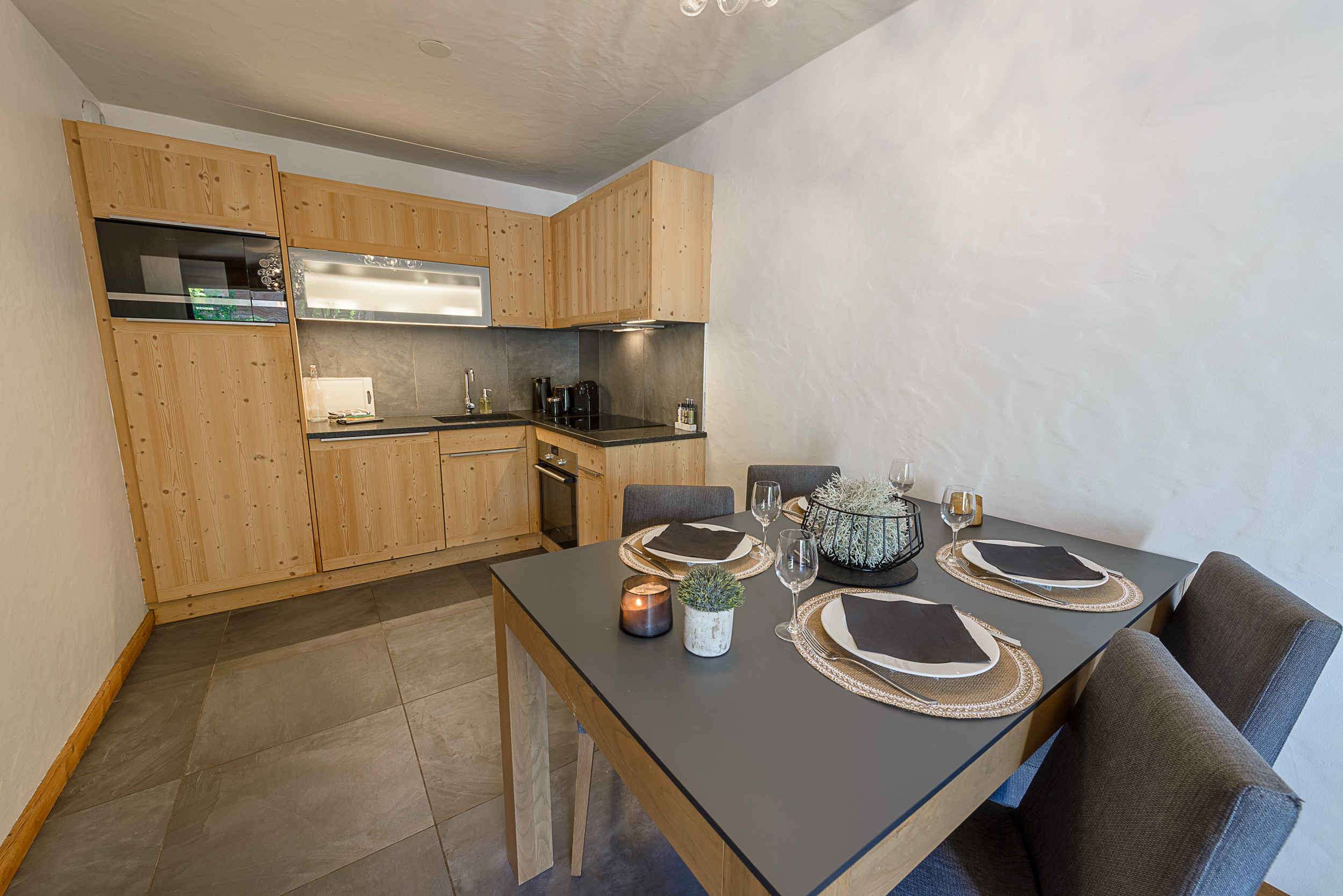 - Kitchen area opening onto the living room, fully equipped with induction hob, oven, microwave, fridge and dishwasher