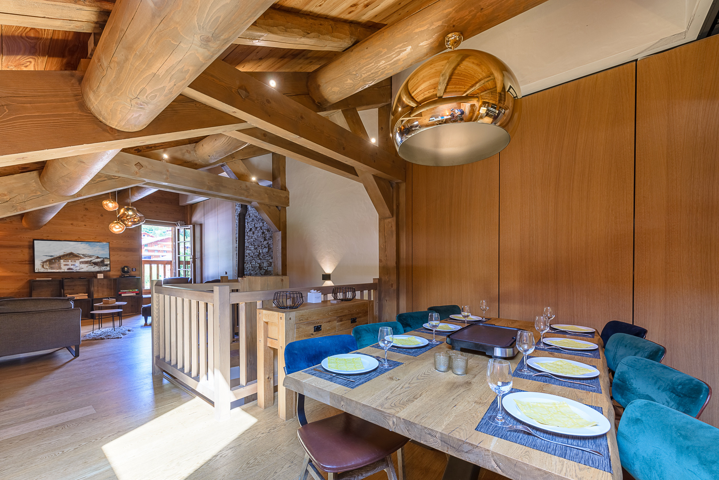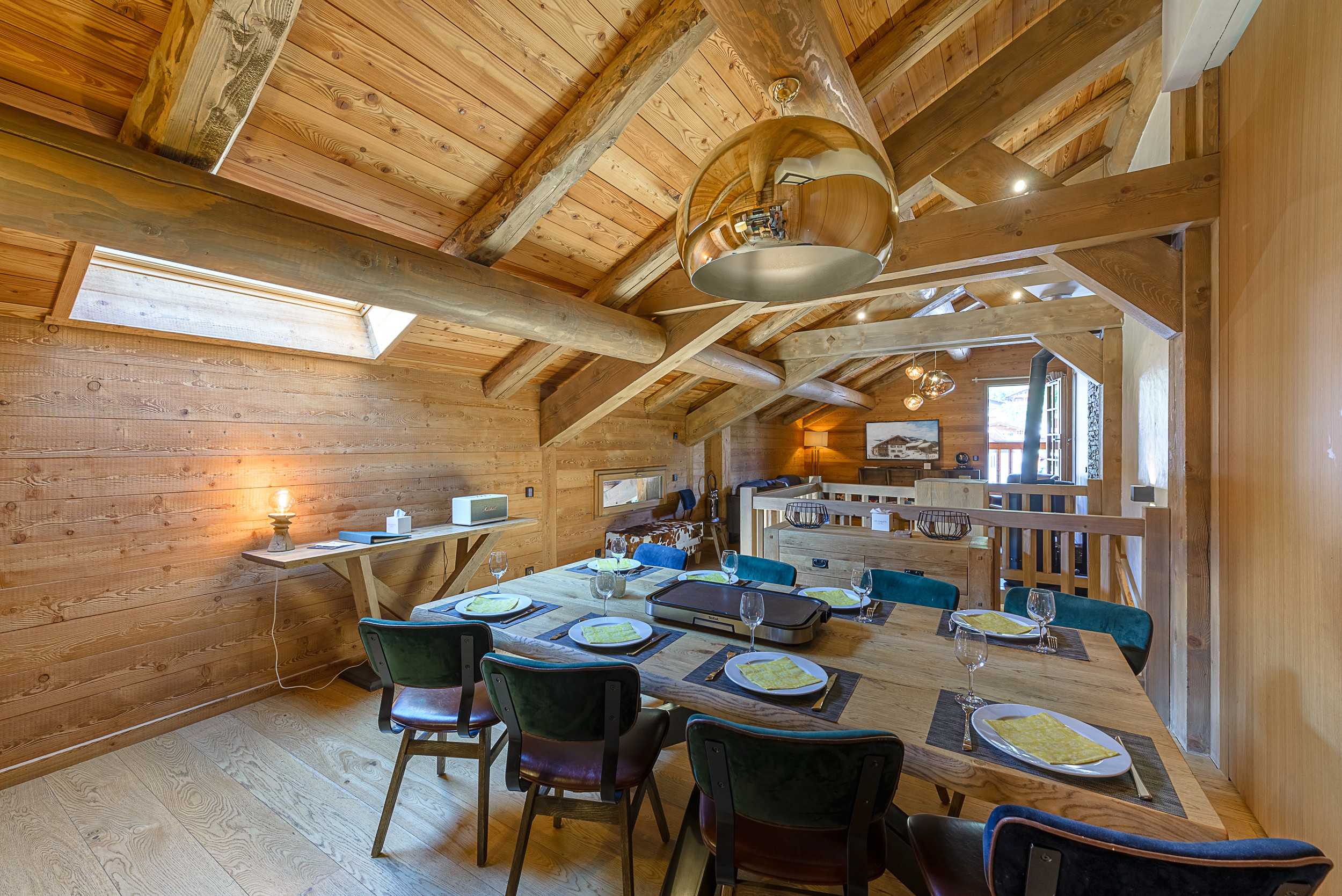 Each half-chalet features a private outdoor jacuzzi to enjoy the surrounding nature. During peak season, guests can also enjoy the warmth of the sauna located on the ground floor. The chalet's uniqueness lies in its modularity, offering two large interconnected apartments: one for 9 people and the other for 13 people. Thus, this luxurious chalet can accommodate an unusual capacity of 22 people! Available amenities include 10 bedrooms, 10 bathrooms, sauna, and 2 jacuzzis. The dining table is designed to accommodate 22 people.