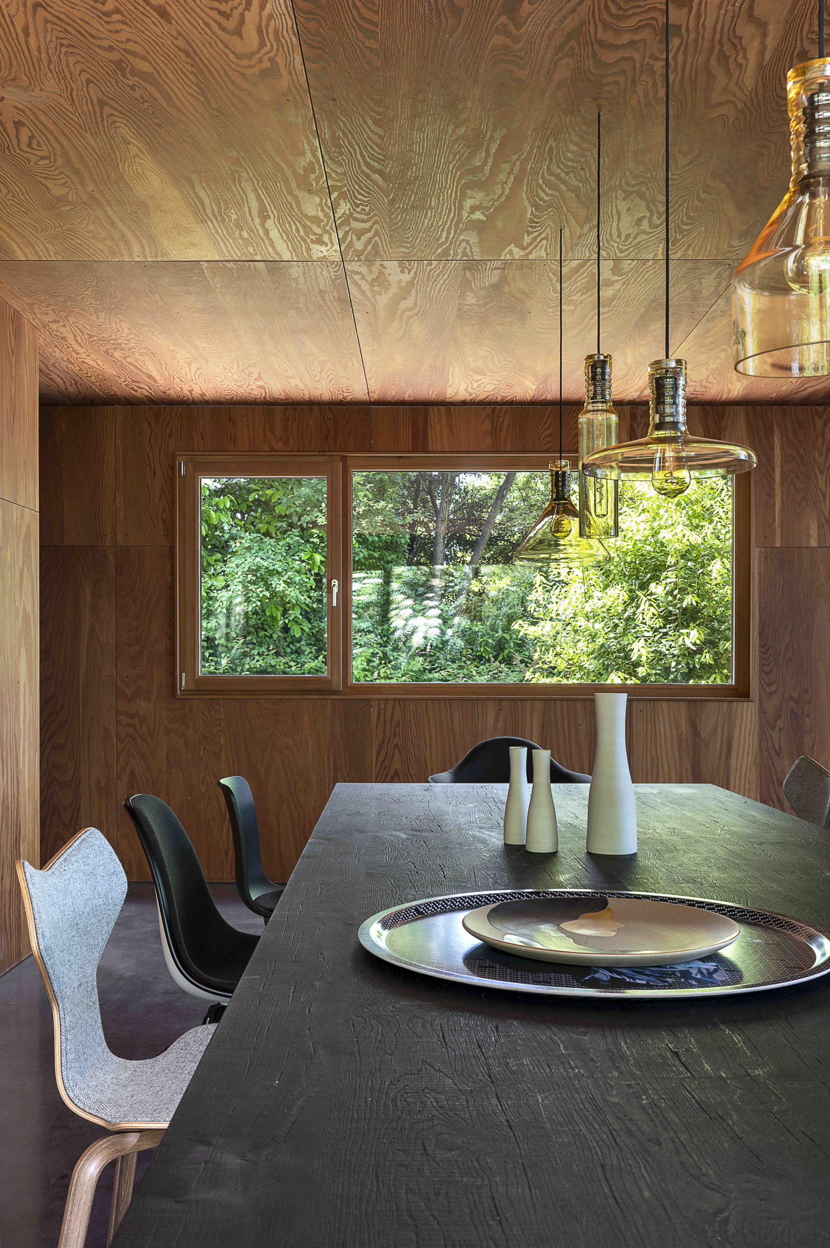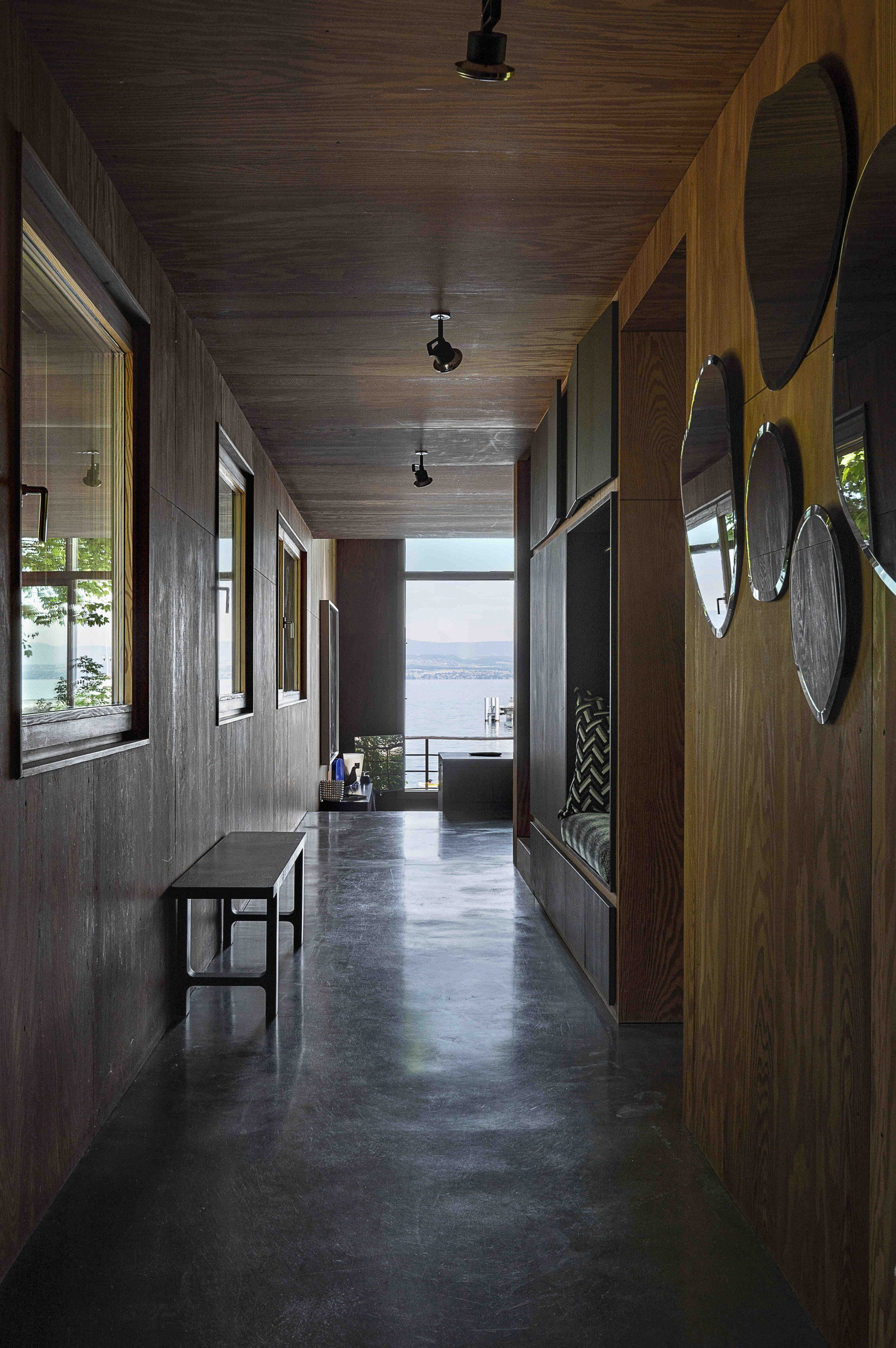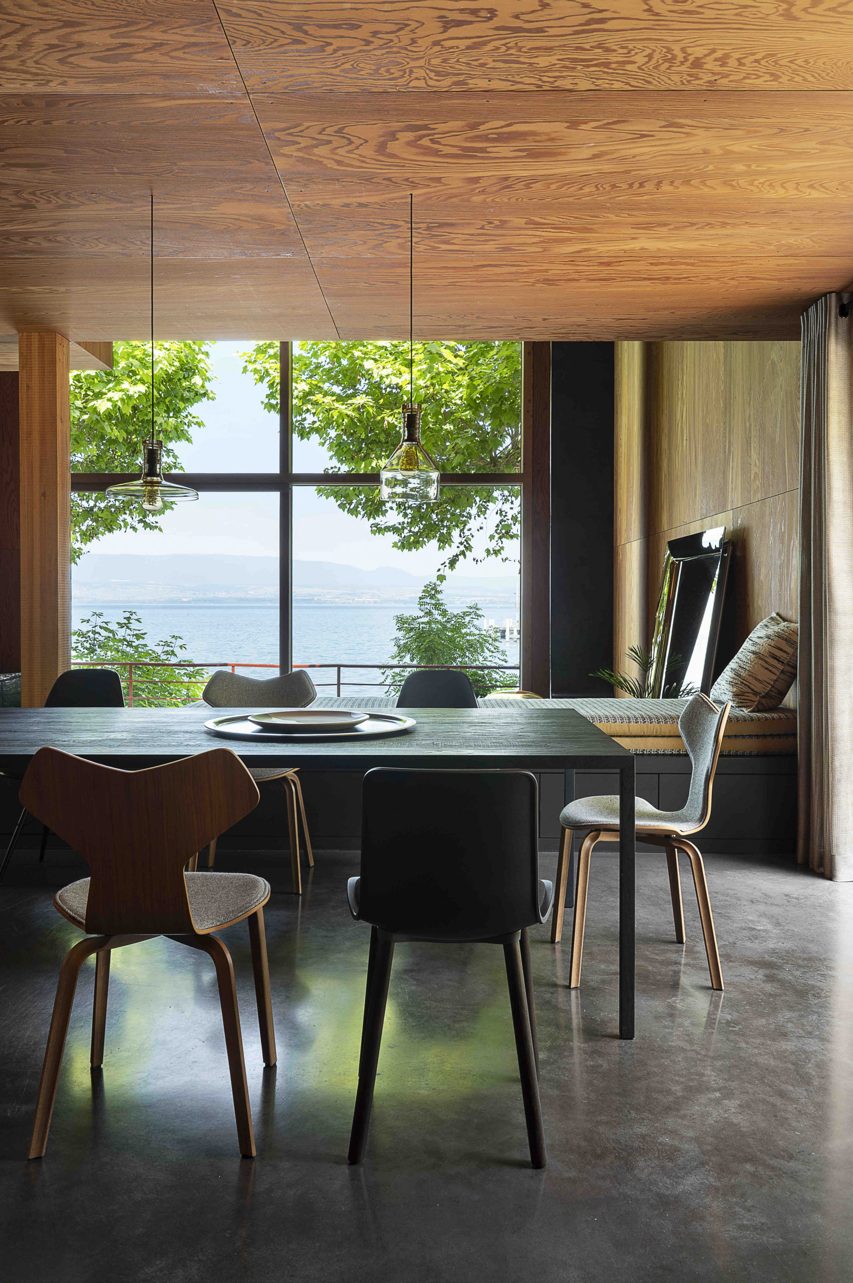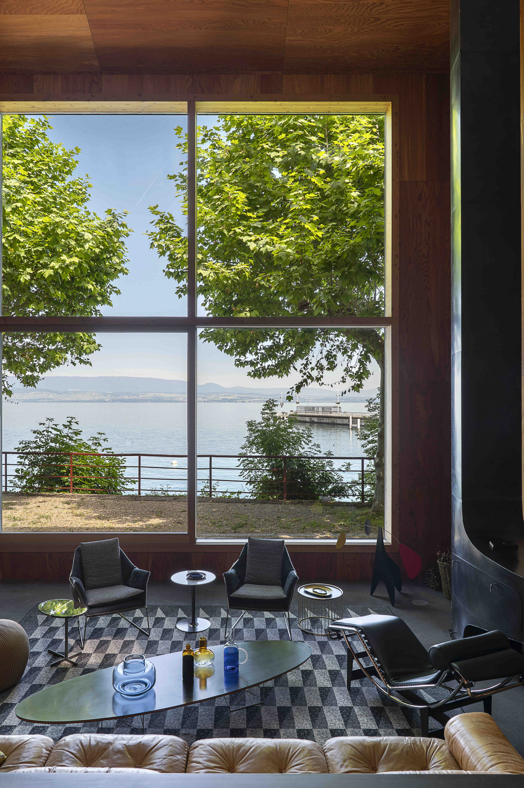 Its creator wanted it to be long, guiding the eye towards the horizon and inviting it to get lost in the distance on the lake. Made entirely of wood, black steel and concrete, the impressive ceiling height is supported by cathedral windows and a large patio window.