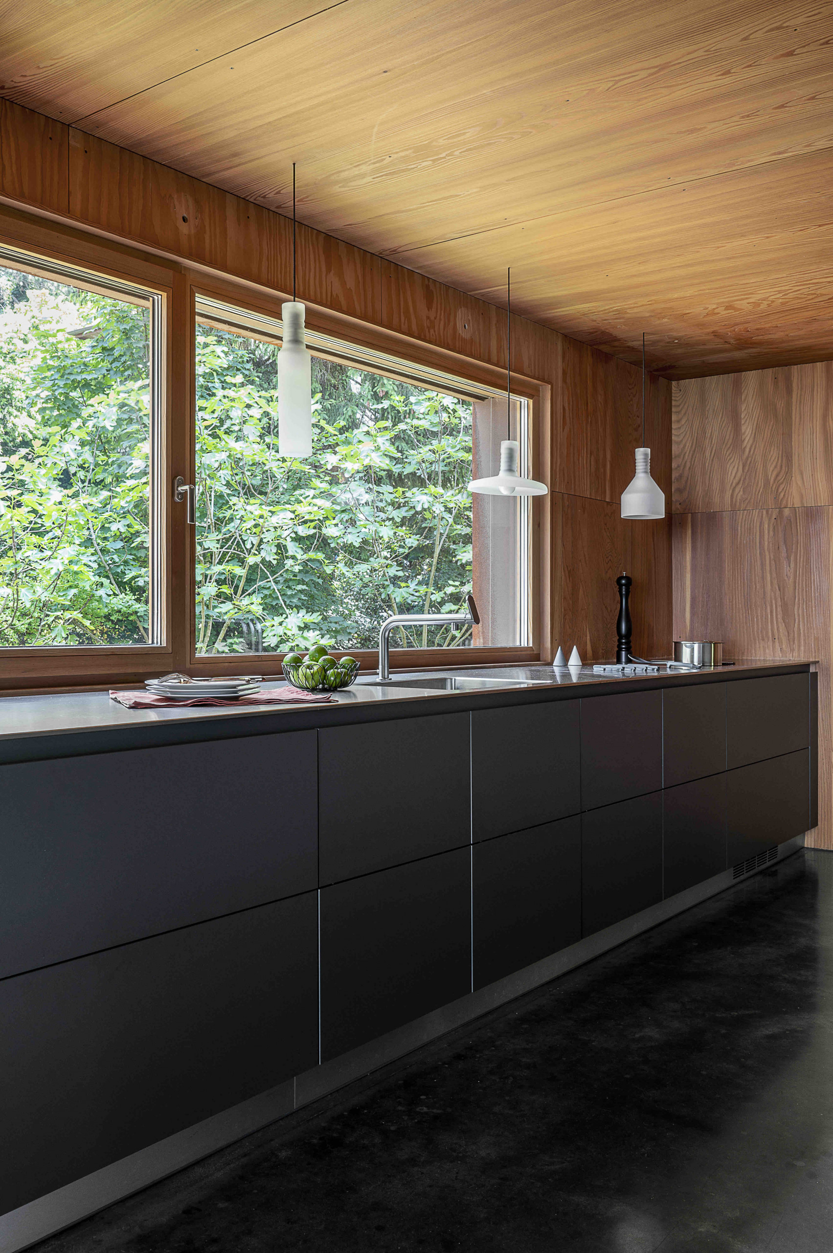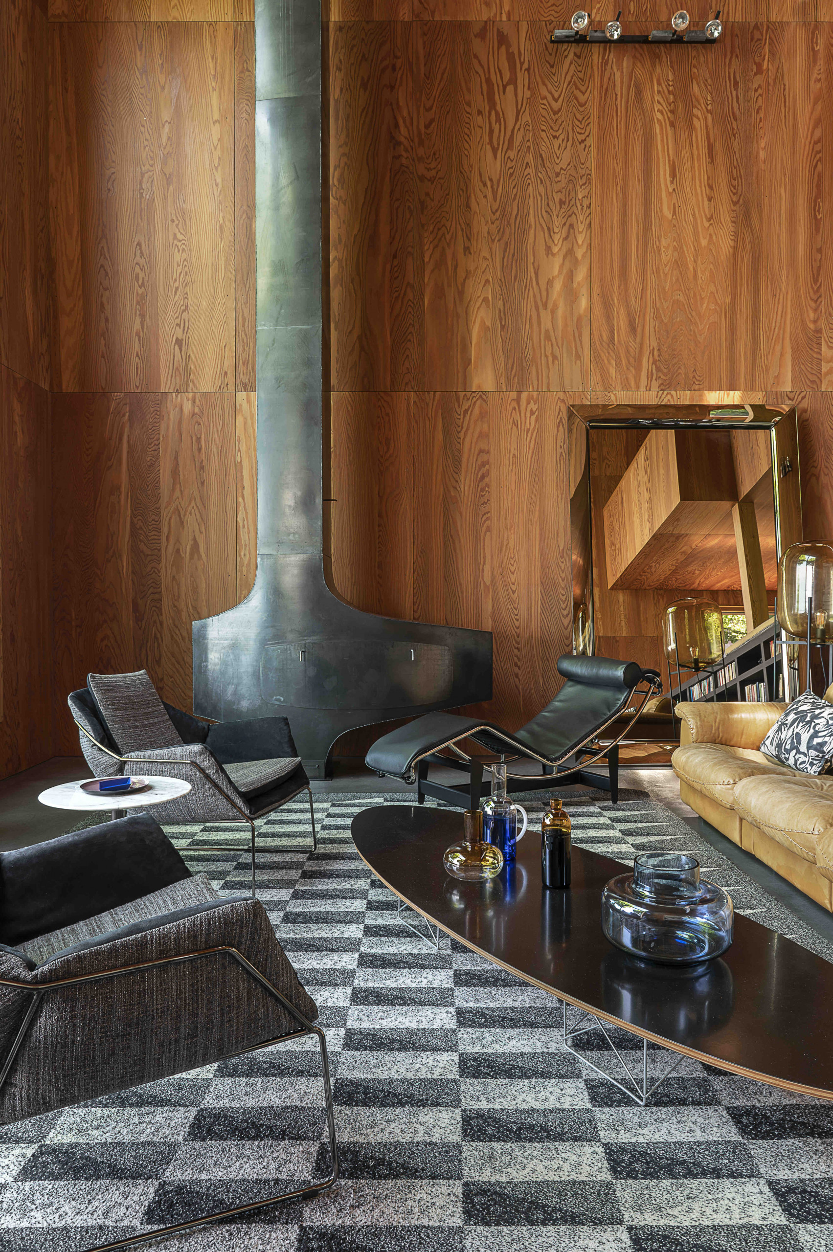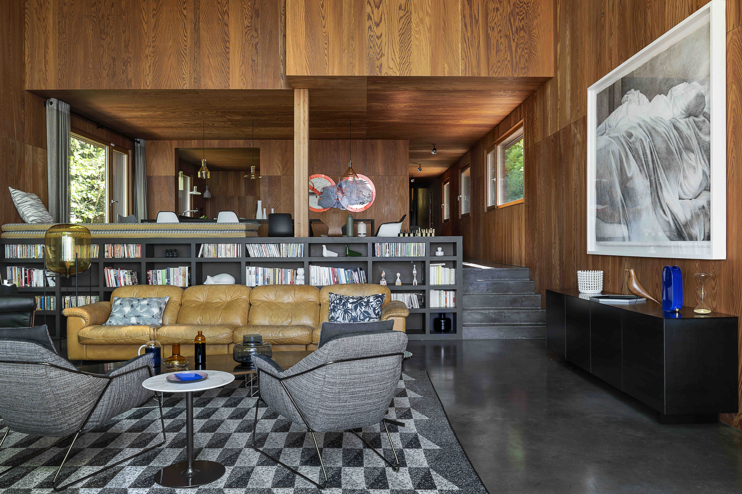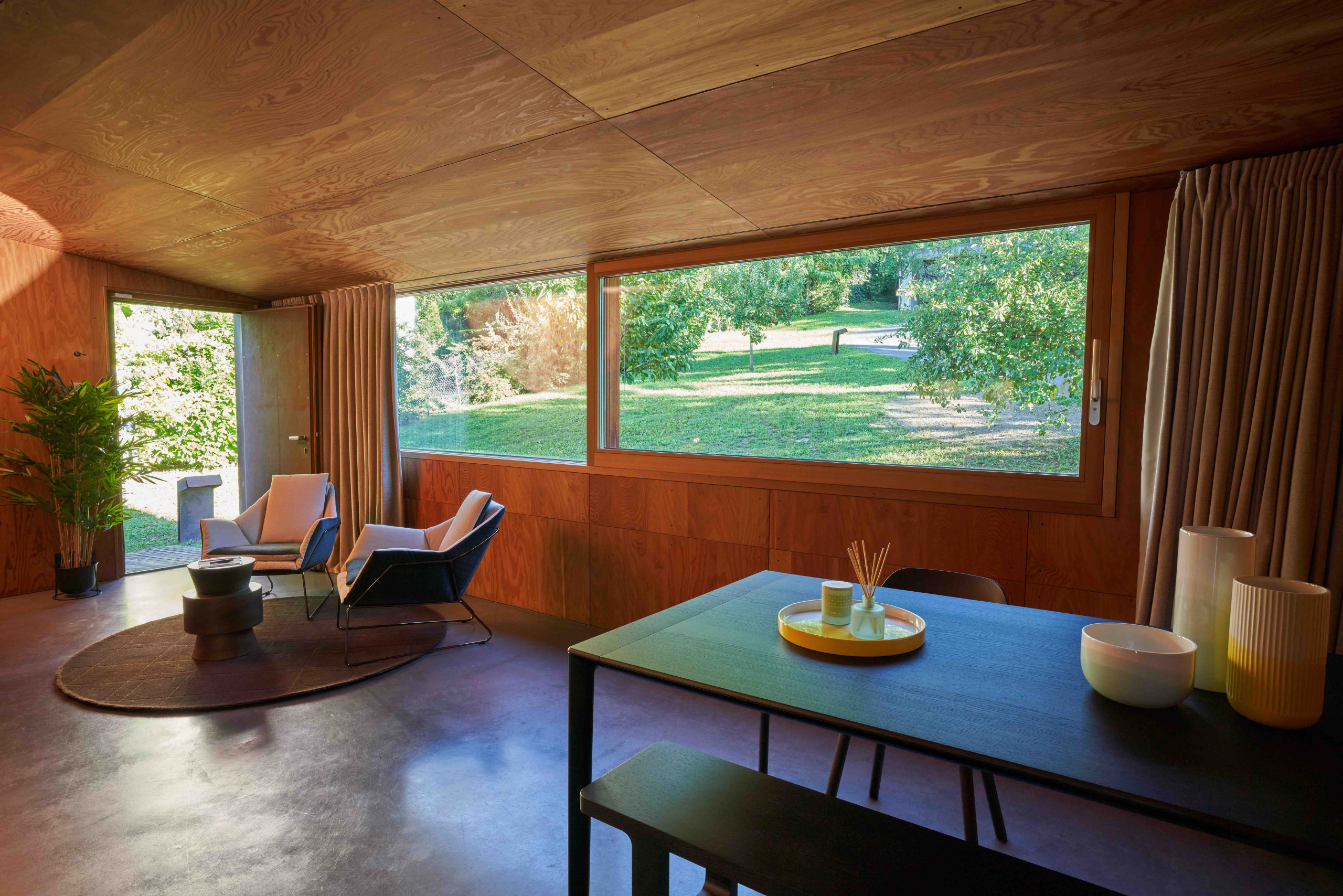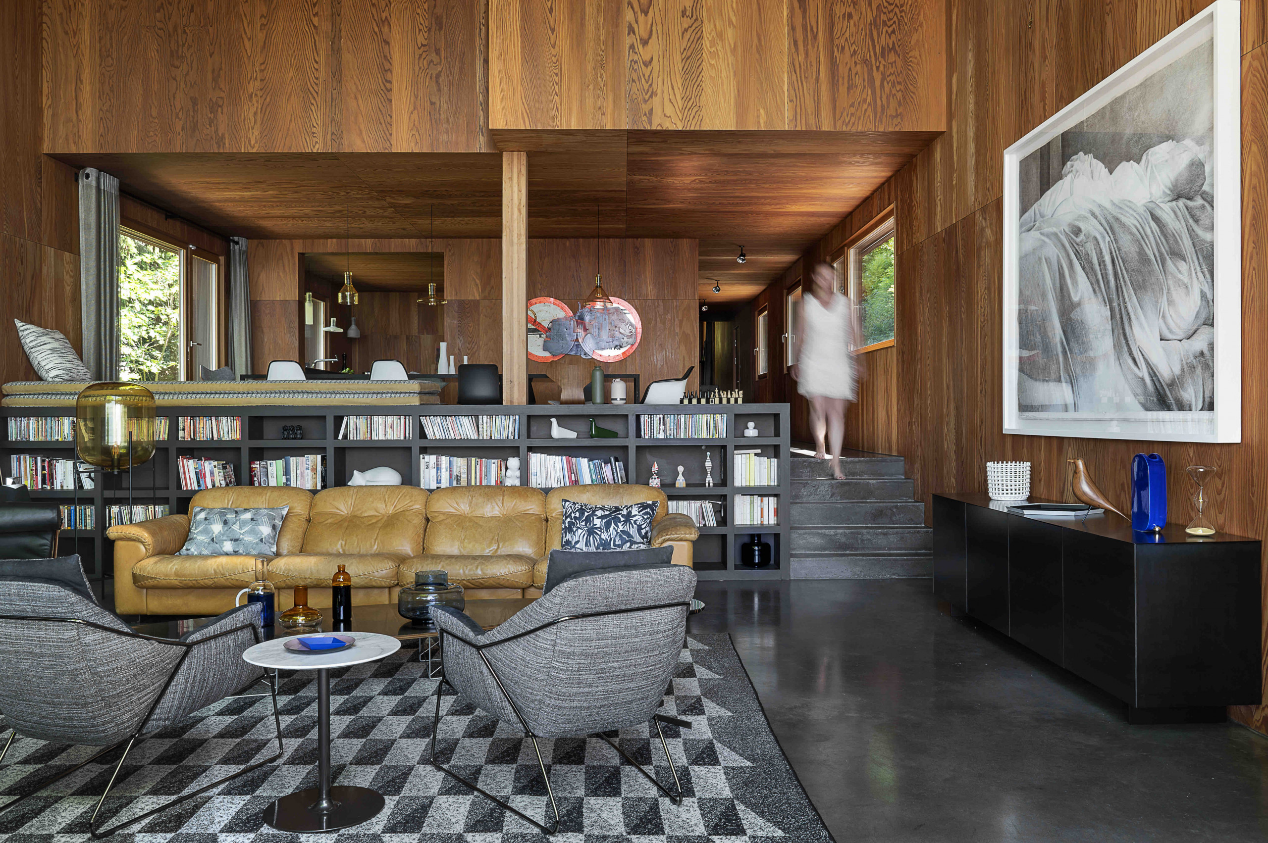 Its creator wanted it to be long, guiding the eye towards the horizon and inviting it to get lost in the distance on the lake. Made entirely of wood, black steel and concrete, the impressive ceiling height is supported by cathedral windows and a large patio window.