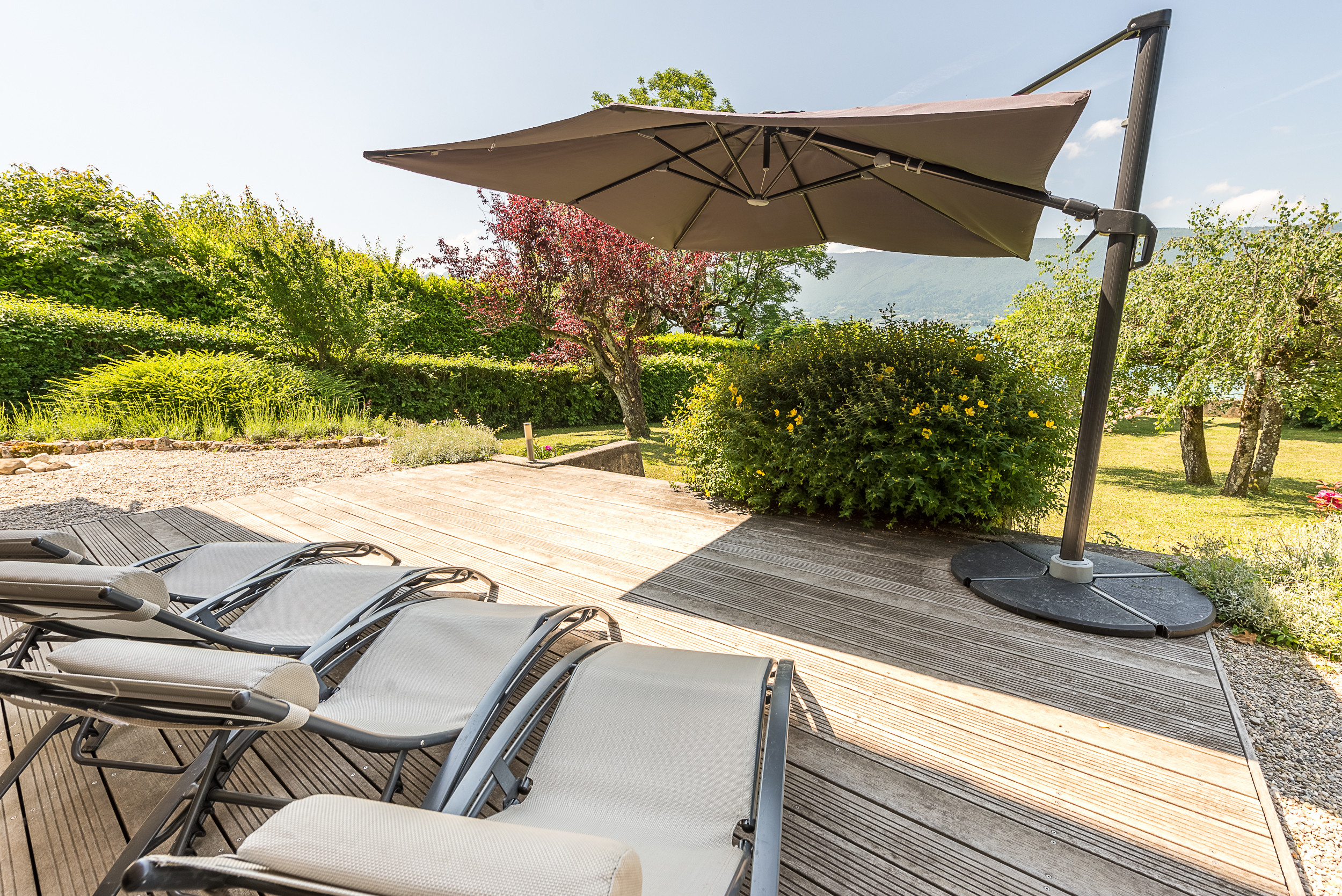 - Wooden terrace of 50m2 built in 2015 with stunning lake views. Furnished with an umbrella, garden furniture, and sun loungers.