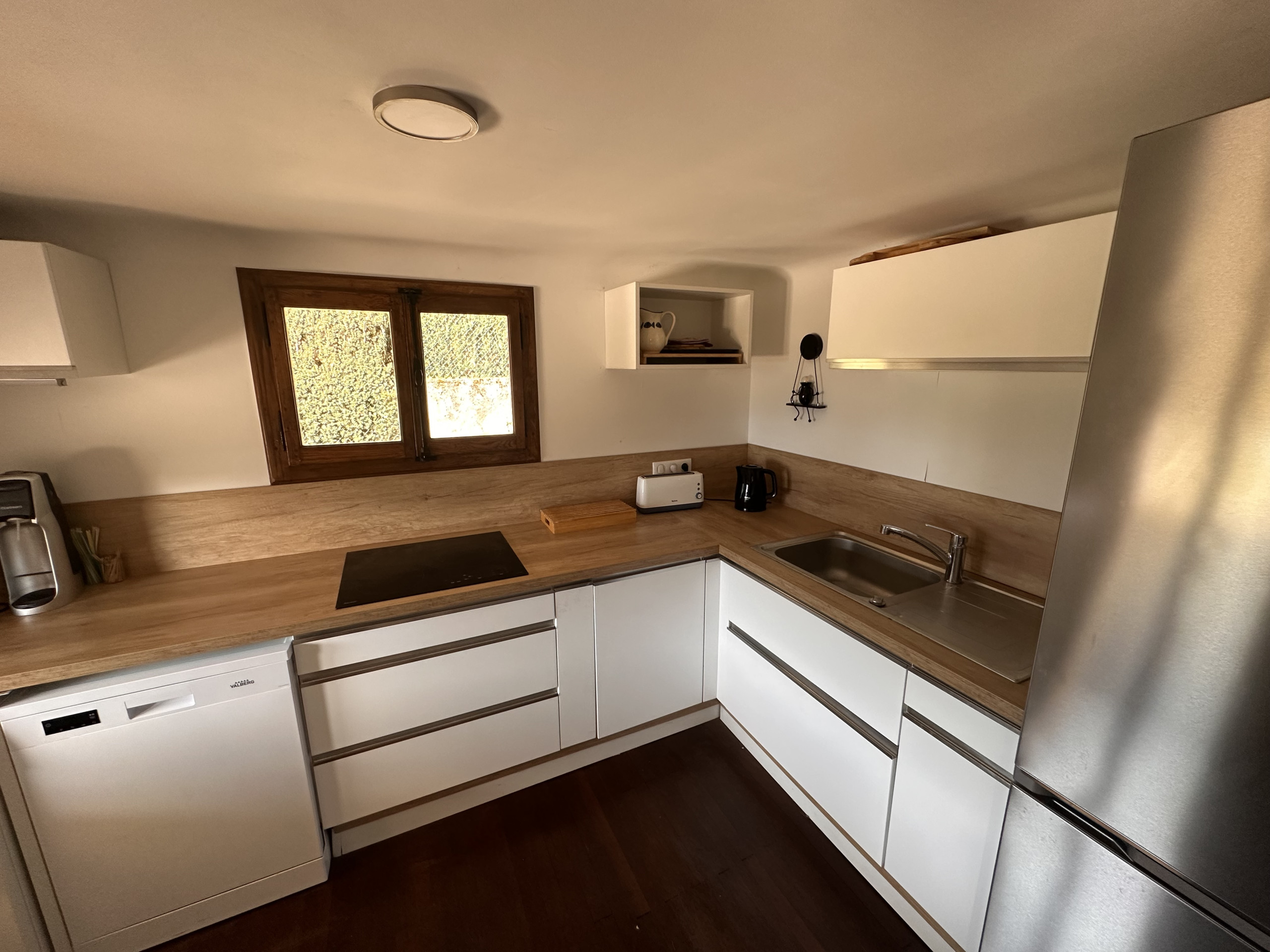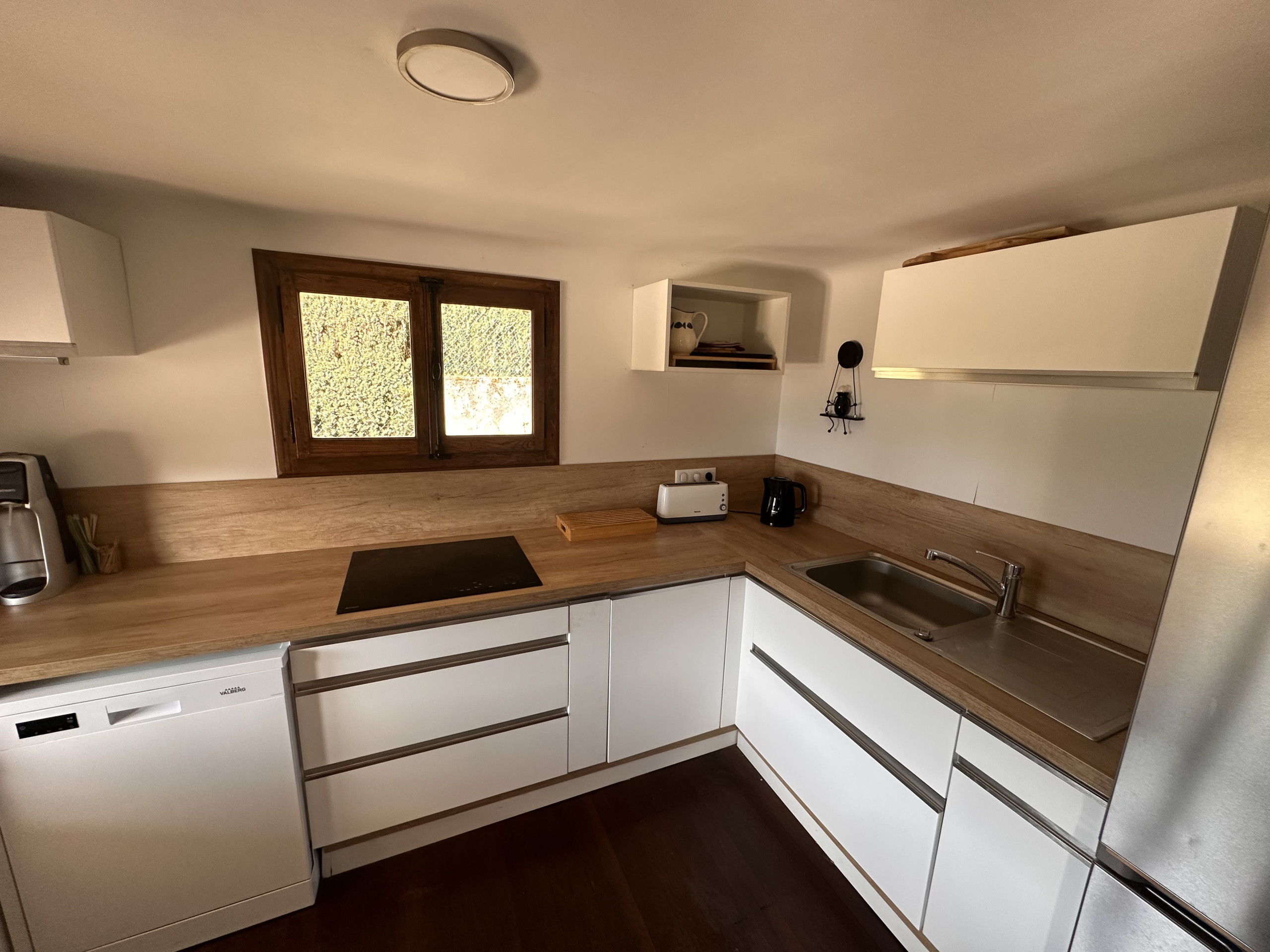 The chalet has 2 traditional kitchens: one at the top with ceramic hob and one at the terrace level with induction hob. Each kitchen has a fridge with freezer and dishwasher. The washing machine is in the downstairs kitchen.